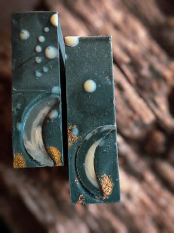 Indulge yourself in the ultimate moon bathing experience. The Crescent Moon comes alive with all-natural tea tree and eucalyptus oils, activated charcoal, indigo, and dazzling gold bio-glitter, all complemented by beautiful hand-carved crescent moon embeds.